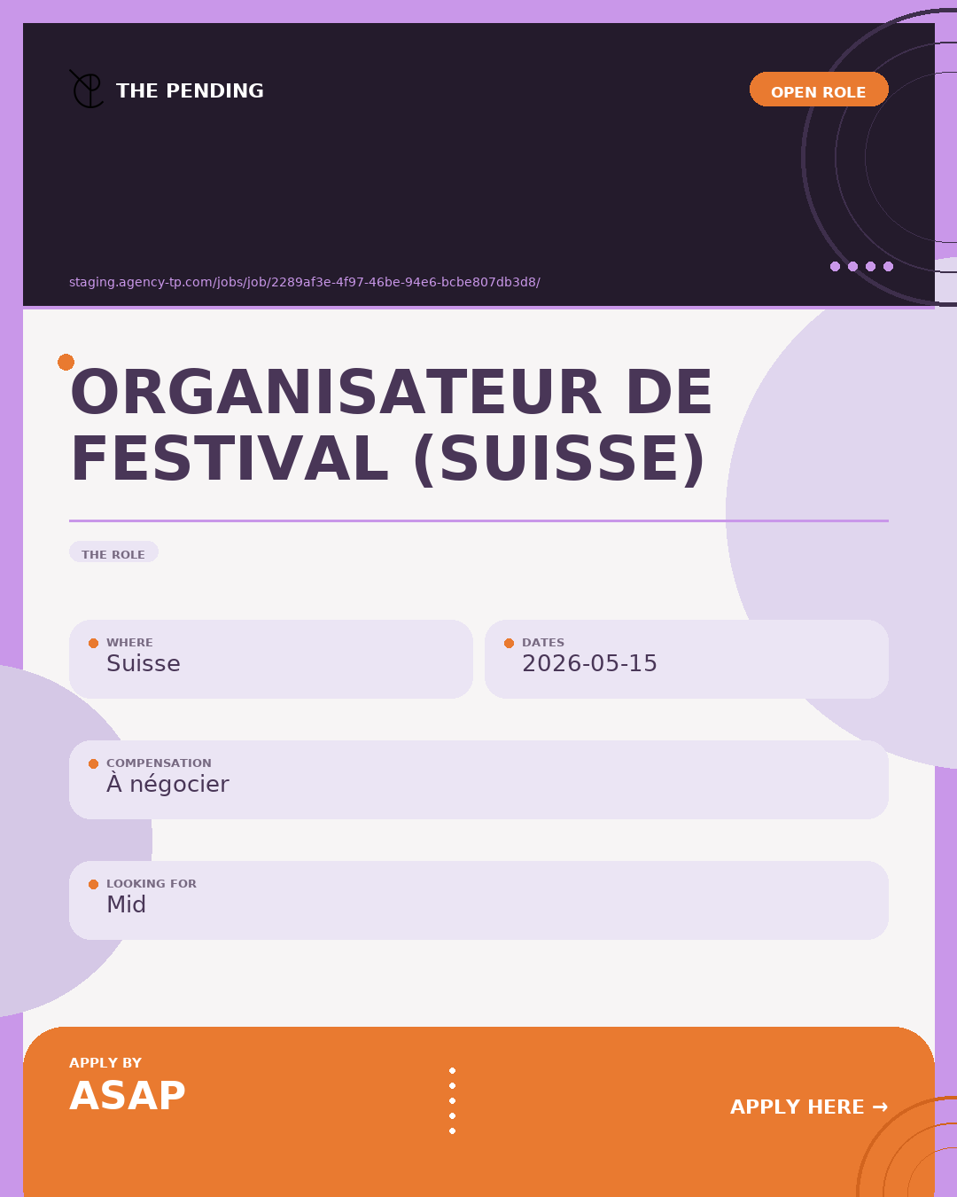 Nous recherchons un organisateur de festival expérimenté pour coordonner et gérer un festival en Suisse. Responsabilités incluant la planification logistique, la gestion des artistes, la coordination des équipes et l'assurance de la qualité de l'événement.