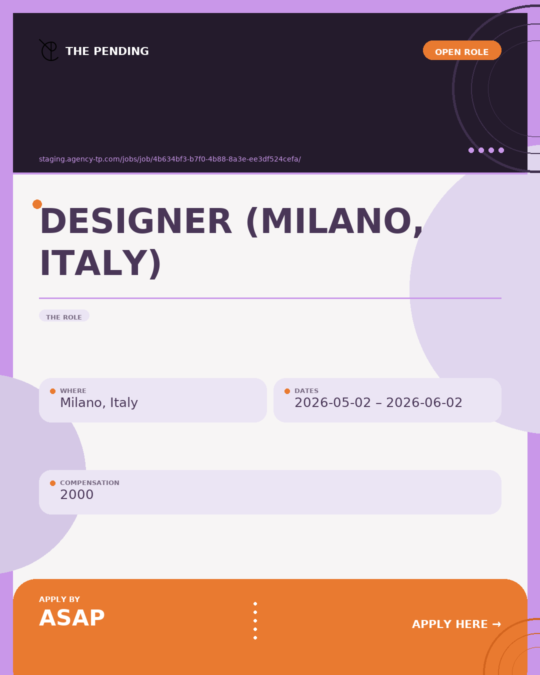 We are looking for a talented designer to work on creative projects in Milano. Experience in design principles and creative software is required.
