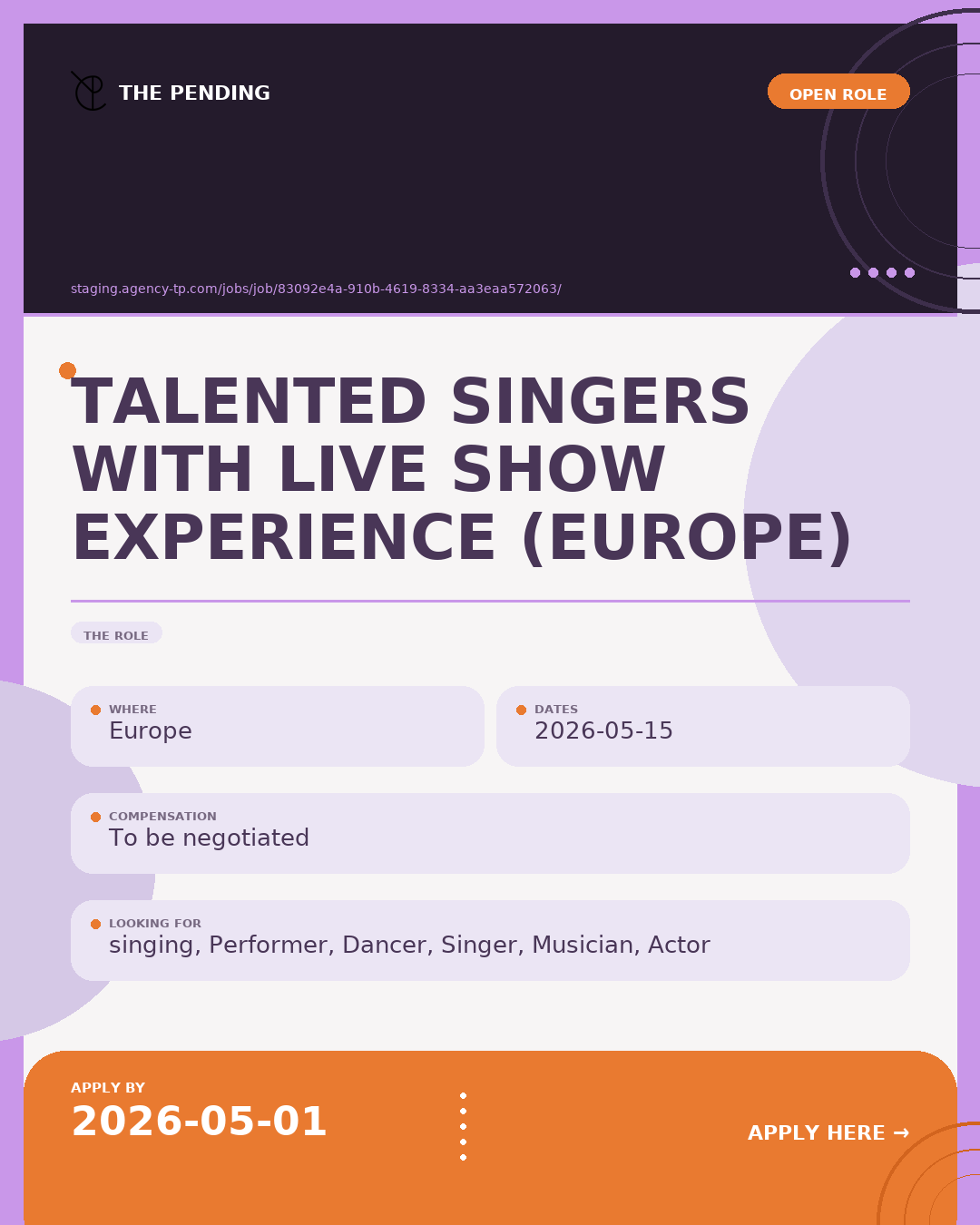 We are looking for talented singers with proven live show experience. Candidates should have a strong stage presence, professional vocal abilities, and experience performing in front of audiences. Professionalism and reliability are essential.