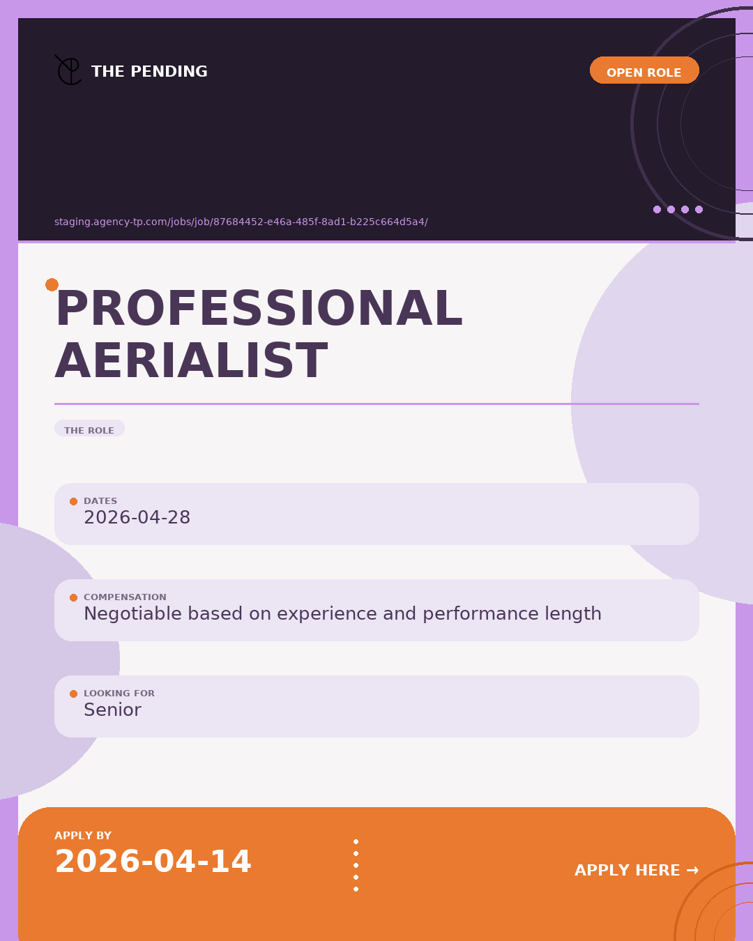 We are seeking an experienced professional aerialist for an upcoming performance or event. The ideal candidate should have extensive training and certification in aerial arts, including skills in silks, trapeze, hoop, or other aerial disciplines. Must demonstrate strong technical ability, safety awareness, and performance experience. Professional equipment and insurance required. Flexibility and reliability are essential.