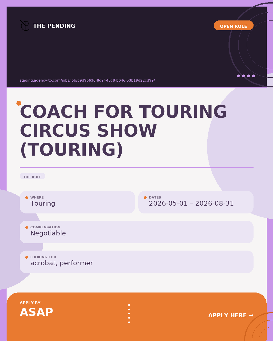 We are seeking an experienced coach for a touring circus show. The ideal candidate will have expertise in training performers, choreography, and circus arts. Responsibilities include coaching performers, ensuring safety standards, refining acts, and maintaining performance quality throughout the tour. Must be able to travel with the circus production and work with diverse talent.