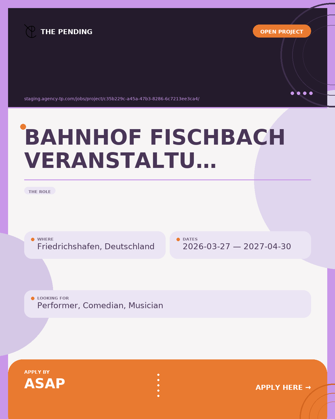 Umfassendes Veranstaltungsprogramm im Bahnhof Fischbach in Friedrichshafen mit regelmäßigen Comedy-, Kabarett- und Live-Musikveranstaltungen. Das Programm umfasst verschiedene Künstler und Performer wie CAVEMAN (Dauerbrenner), Joe Di Nardo, Guido Cantz, POWERAGE AC/DC Tribute Band, Pippo Pollina & Quartetto Acustico und viele weitere renommierte Comedians und Musiker. Veranstaltungen finden regelmäßig von März 2026 bis April 2027 statt.